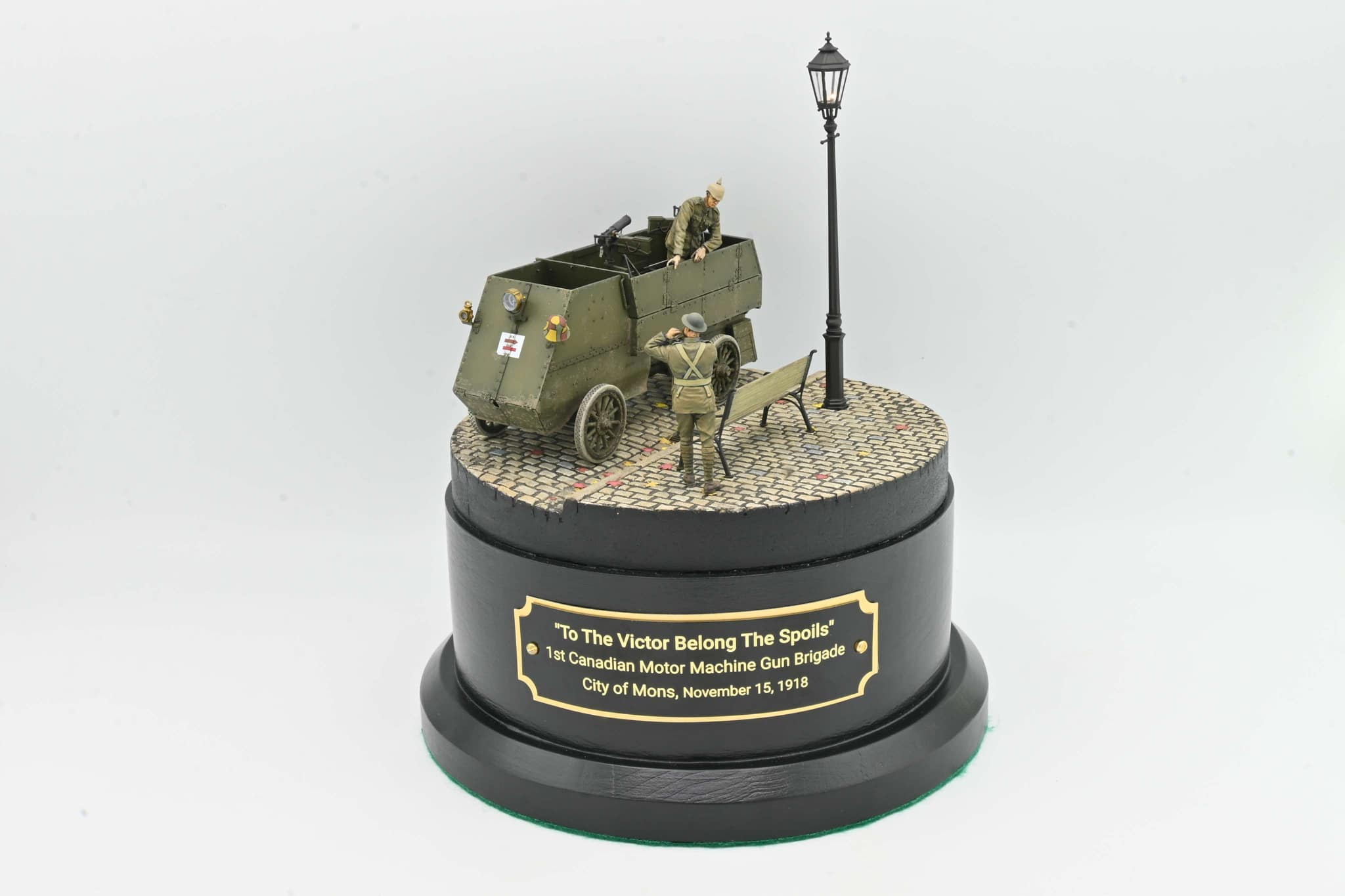 This vignette is intended to show an Autocar Machine Gun Carrier of the 1st Motor Machine Gun Brigade in the City of Mons on 11/15/1918. Period photographs show two armored cars having participated in the Mons Victory parade along with other Canadian units. The Armored Car and Figures are from CSM.