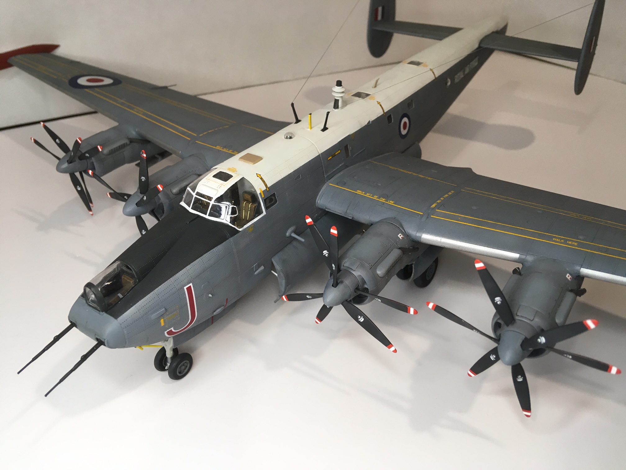 The Shackleton entered RAF service in 1951 as an anti submarine warfare and maritime patrol aircraft. The model depicts a Phase 3 version stationed in Scotland with No.42 Sqn in 1970.The Phase 3 version saw 2 Viper turbojet engines installed in the outboard engines. Modifications include: 1) scratch-built crew work stations in fuselage with a clear plastic cutout installed on the port side for viewing. 2) Scratch-built turbojet air intake panels in extended position.
