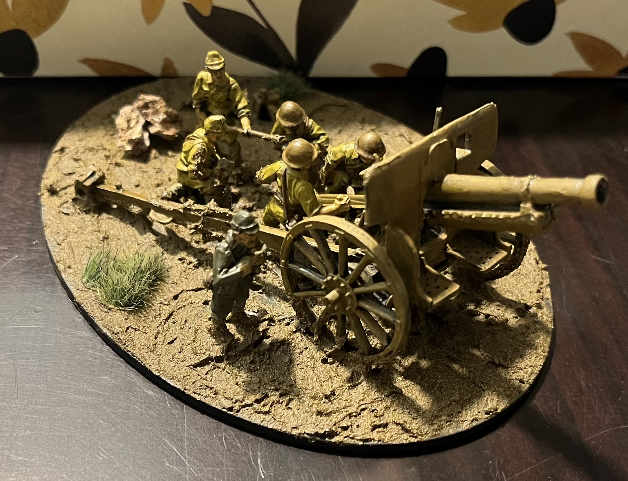 Wash, Vallejo mud, grass tufts and Army Painter rocks for basing. Undercoated the canon in dry brushed silver and applied a thin overcoat of Vallejo English Uniform