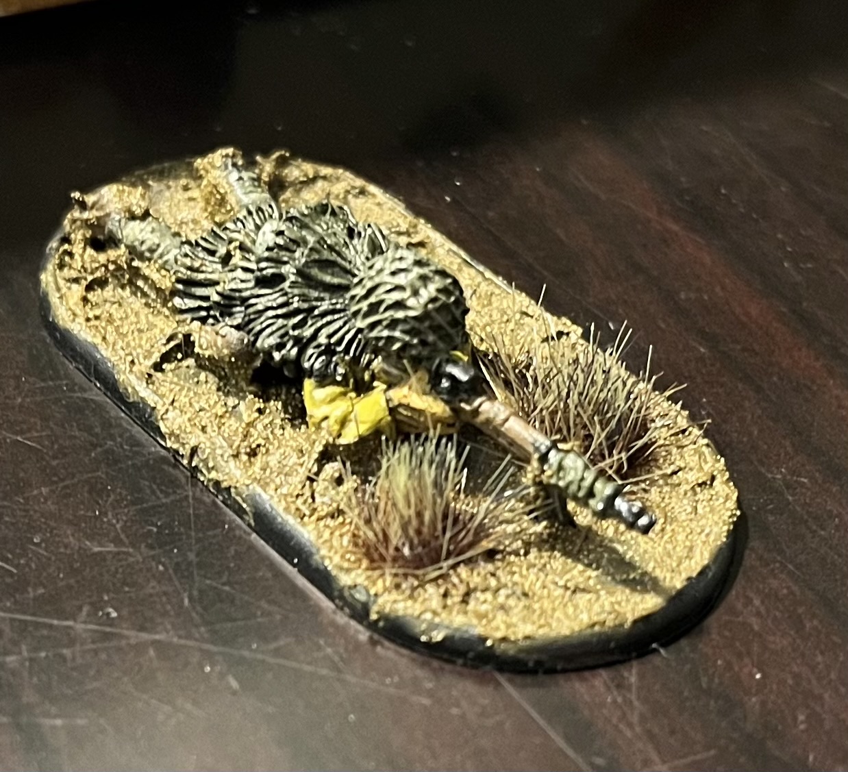 Dry brush of khaki on helmet and Ghilli suit, wash and Vallejo mud and grass tufts used for base