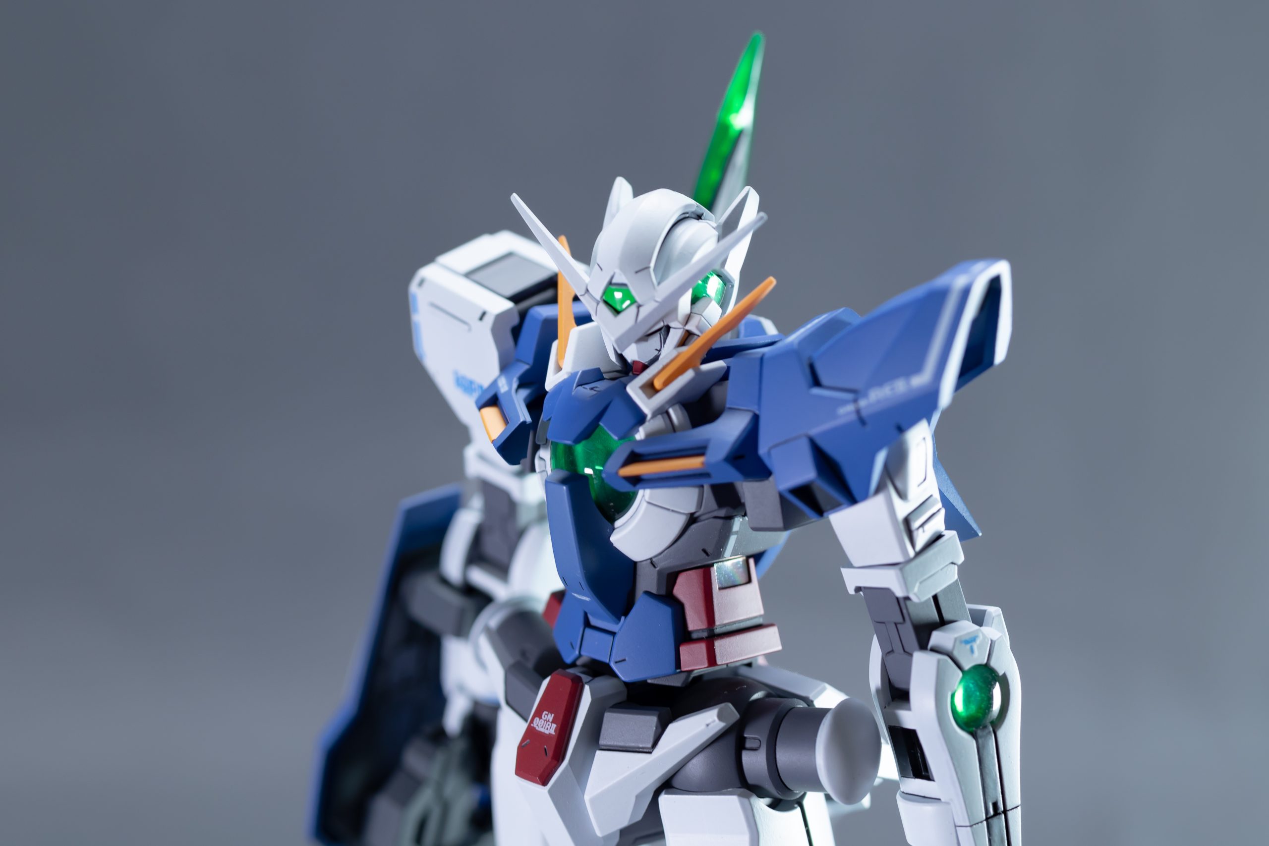 Using the HG Gundam Exia R2 as the base, this model has been modified and painted with a color scheme referencing the official design. All panel lines have been re-engraved, and seamless treatment has been applied where necessary. The knees have been extended by 2mm, and the neck by 0.5mm. The right shoulder has been replaced with the HG GTO RX-78-2 shoulder to reduce the model’s visual width and is now attached via a magnetic mount. The overall design maintains the lightweight characteristics of the original kit, while the asymmetrical modifications enhance its sense of mobility.