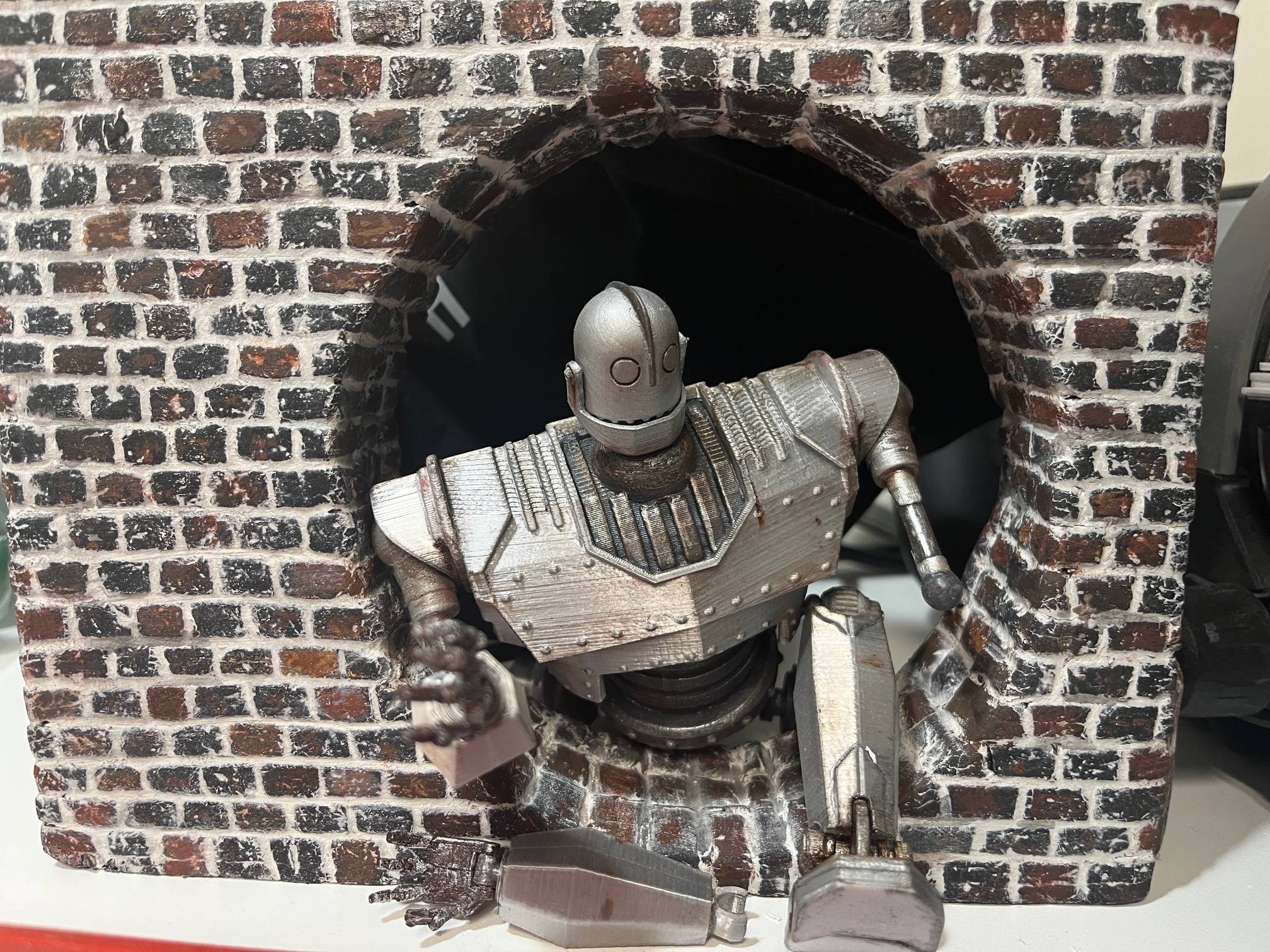 3D printed Iron Giant model (file from Gambody fitted with traditional model parts. Rock face made with high density foam & plaster, aged with acrylic/oil paints. Additional traditional model building techniques used to complete the rest of the diorama.