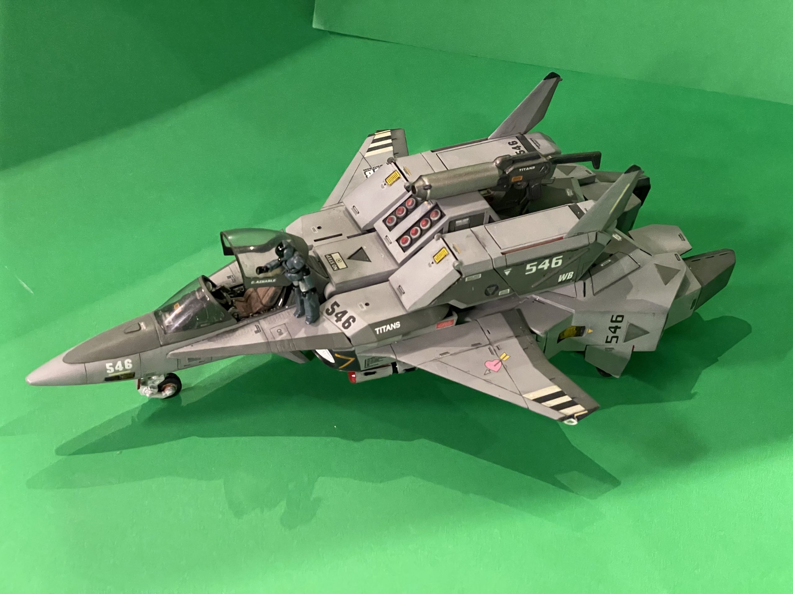 1/48 Alpha Legioss. Transformable kit converted to non-transforming fighter plane mode. Wings re-constructed, engine intake reconfigured, canopy opening mechanism scratchbuilt and pilot pose altered.