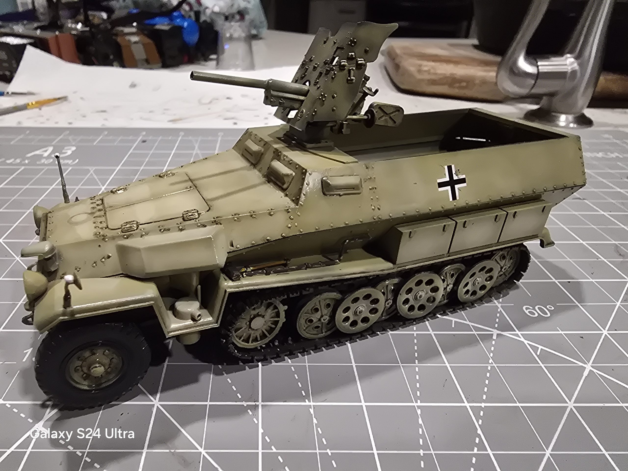 Is used the tamiya sdkfz 251 and the tamiya PAK35/36 on top as the cannon . It was painted german yellow and then faded . It was given a pin wash with AK wash for Africa tanks . Then dull coated for protection. It’s my favorite one i have made so far . I saw the real one at the tank museum in Oshawa and wanted to build it ever since.