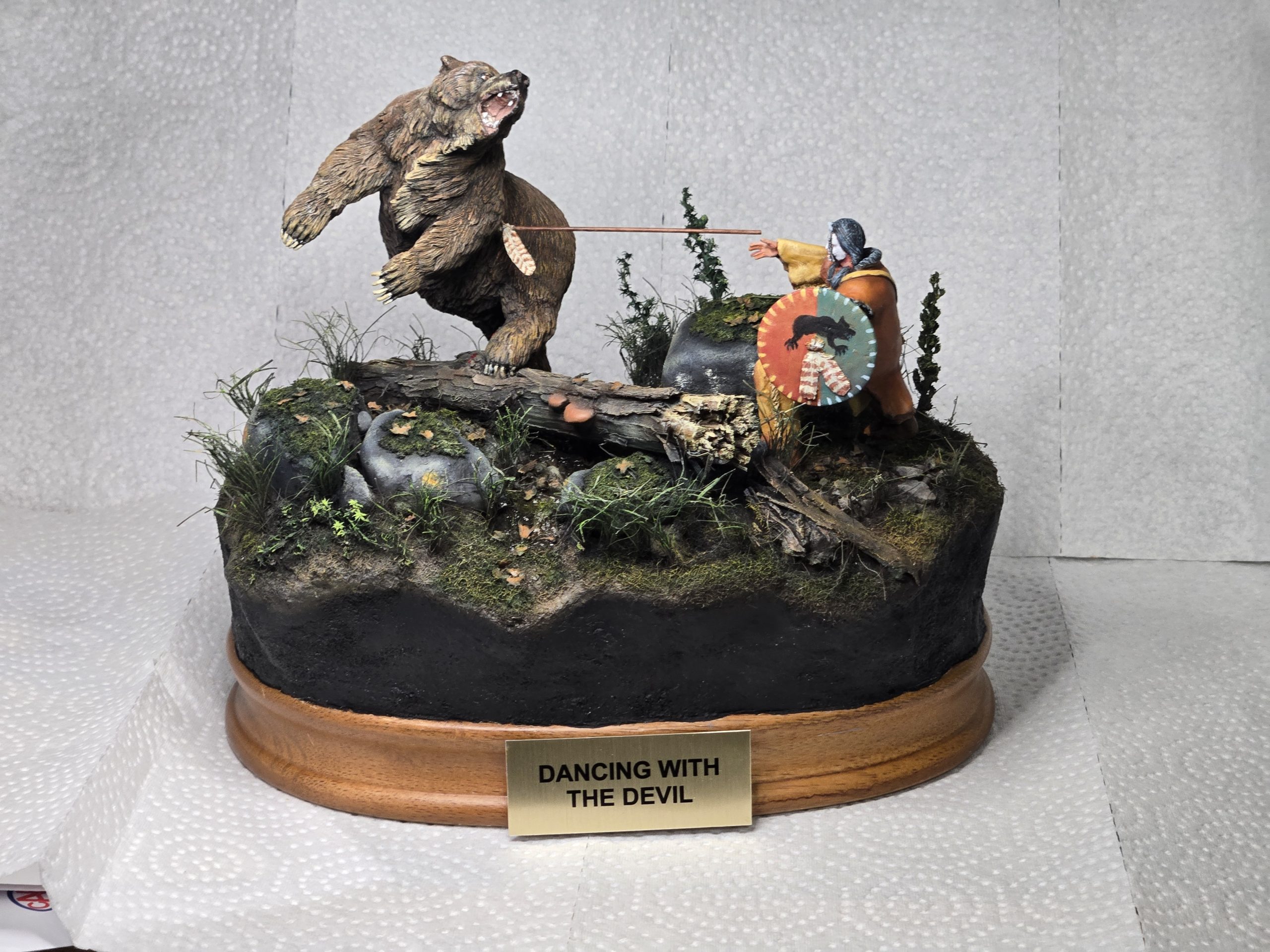 Grizzly Bear-paper clips soldered together and Apoxie Sculp to build the body up and shaped with #11 blade. Native created using Apoxie Sculpt and Kneadatite Blue /Yellow putty. Ground work made up of Apoxie Sculpt and natural things like vine ,rocks and some vegetation. long grass from rope. Paint. Oils(Windsor Newton) and Acrylics (Vallejo &AK)