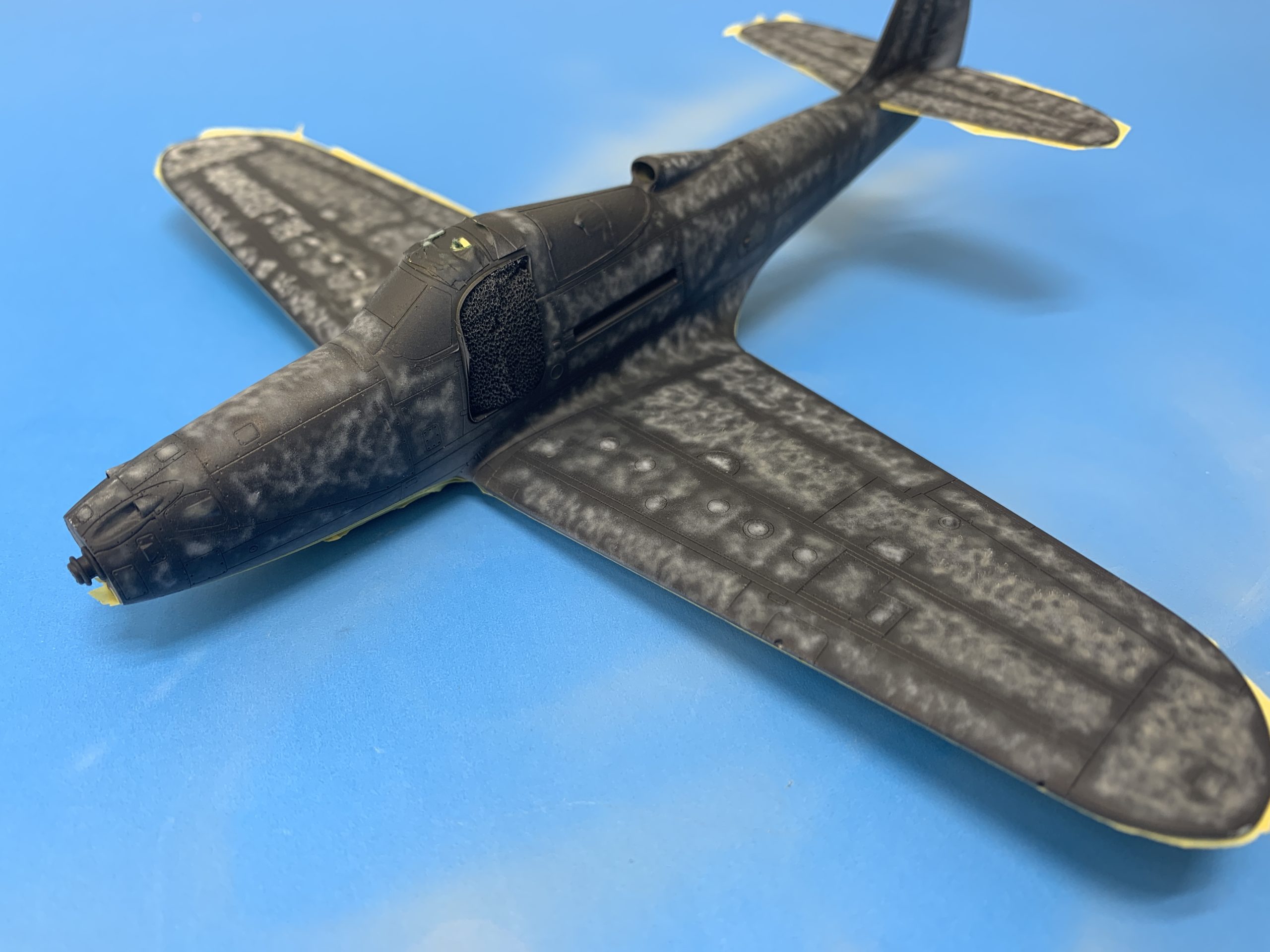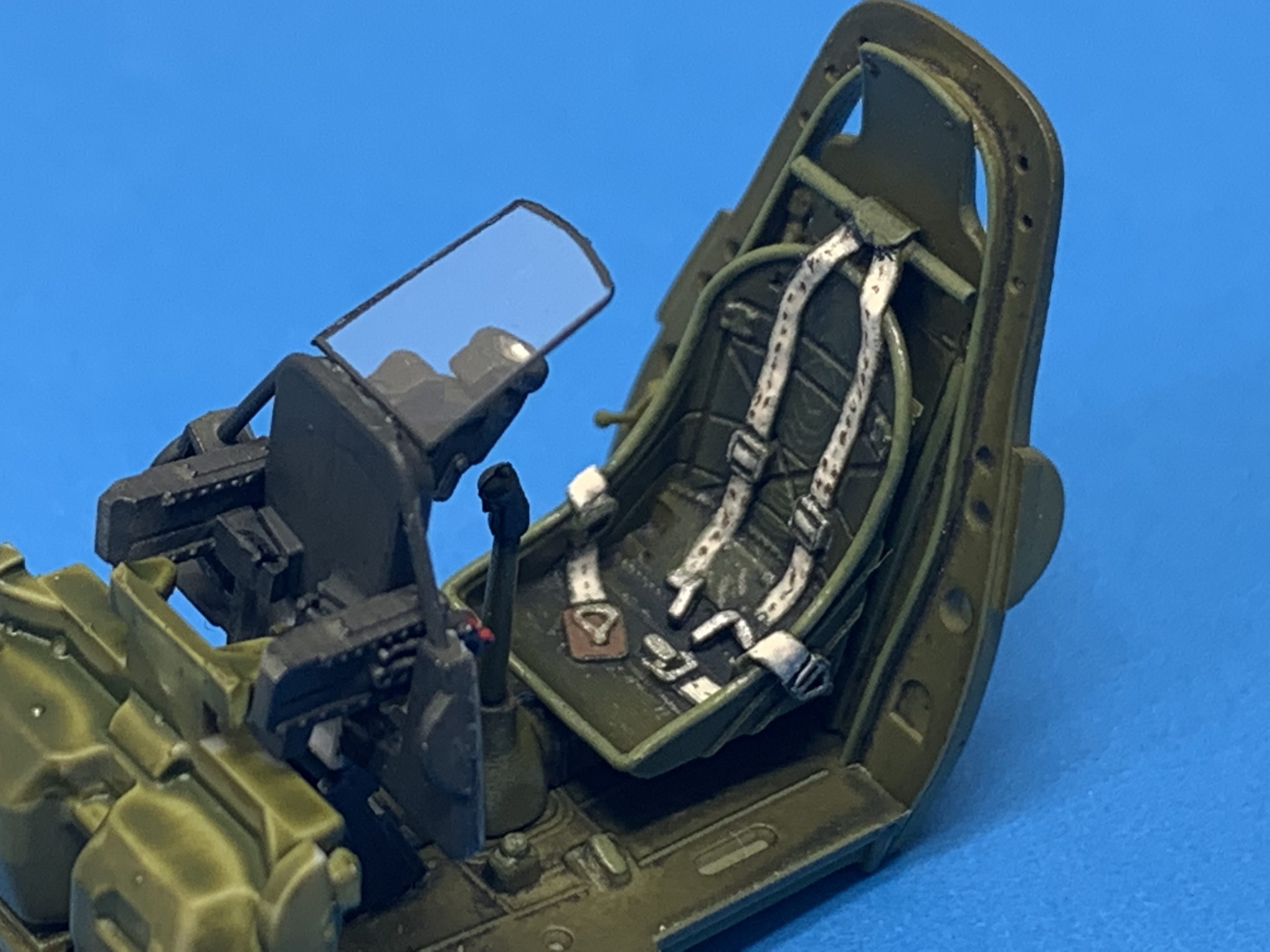 The paint was applied over a black base with grey, buff and white mottling. I use Gunze for the olive drab