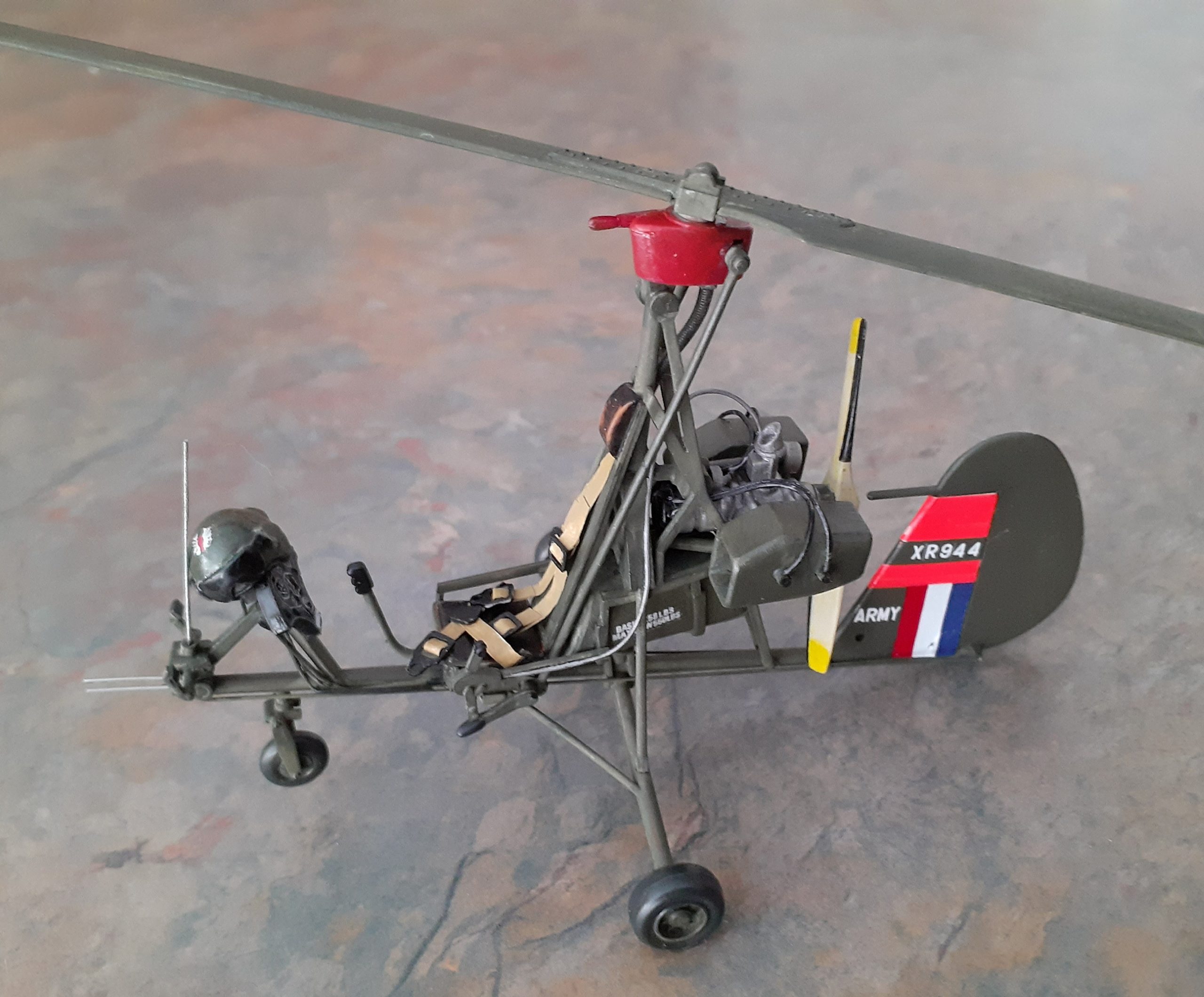 Kit is James Bond Autogiro, built as one of the 3 tested by the British Army as battlefield reconnaissance platforms. Added details: rudder control cables, instrument wires, throttle cables and ignition harness. Seat belts from paper, and buckles from 0.015 plastic sheet. Helmet from a Harrier kit.