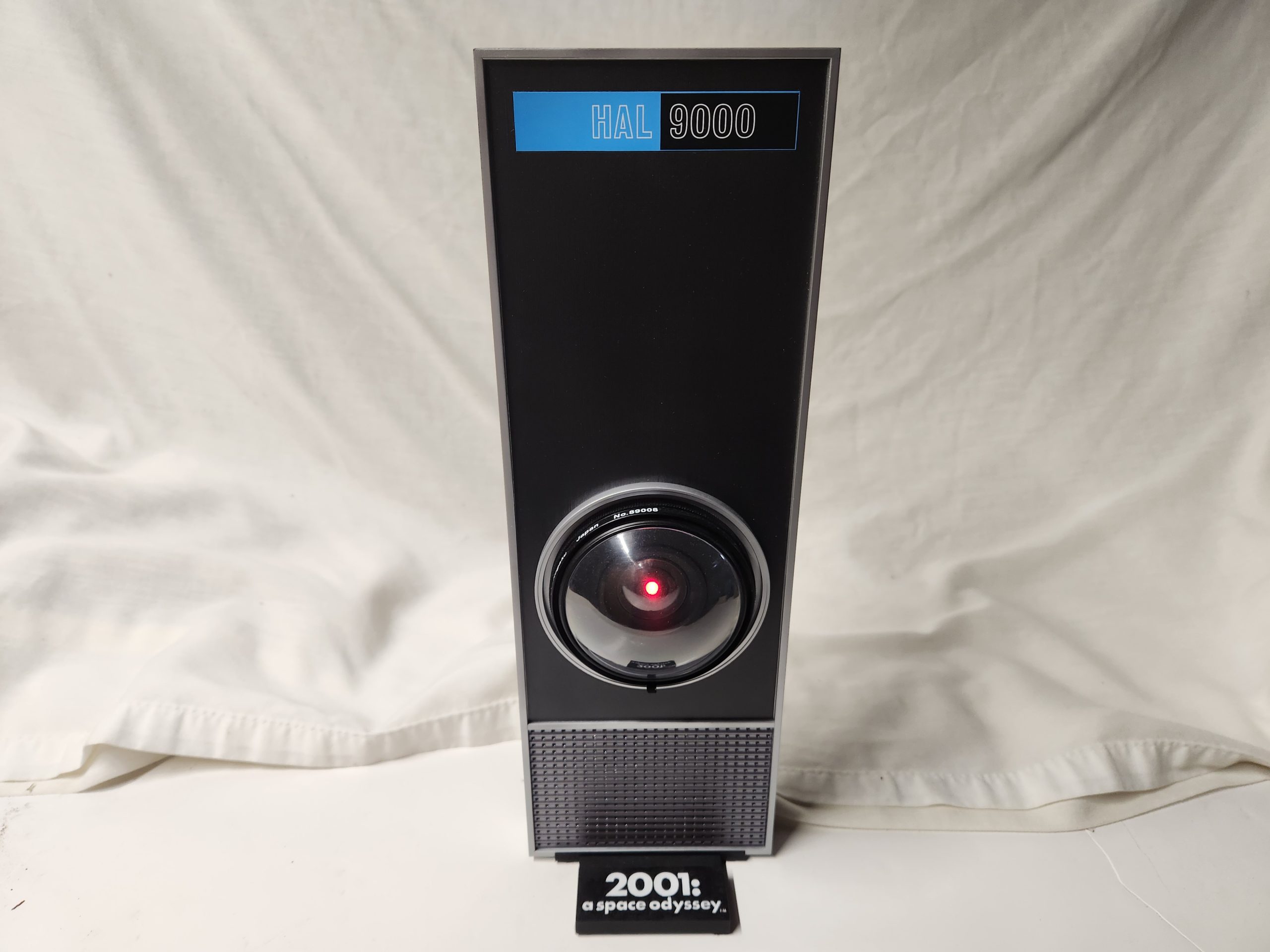 Moebius full scale HAL 9000 control panel from the movie 2001: a space odyssey. The kit was built out-of-box, with the speaker panel drilled out. A sound module was added with a recording of the famous line from the movie. A touch sensor was added so the sound can be played by touching the 2001 logo on the base. The red LED in the lens is part of the kit.