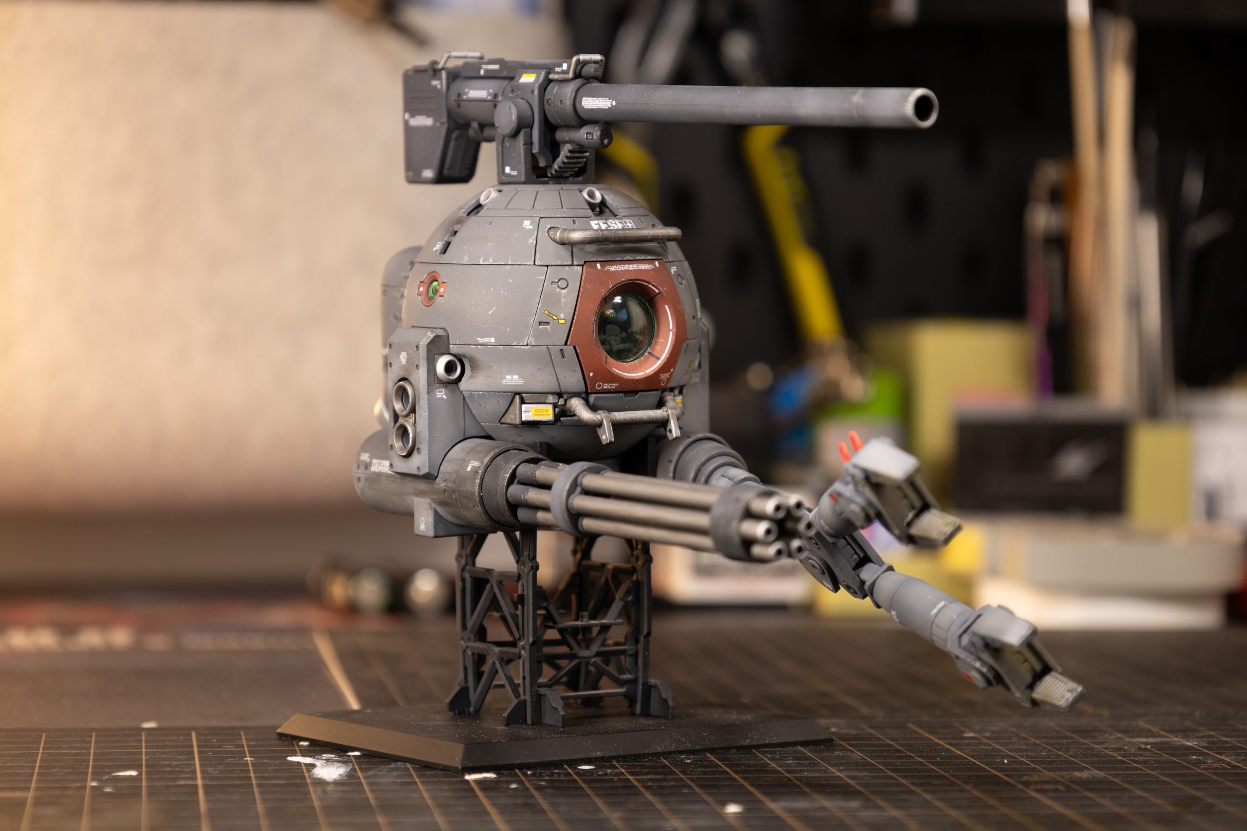 This custom model of the RB-79 Ball is a lightly modified variant fitted with a 120 mm Gatling and extra manipulator to assist as an anchor whilst firing, countering the inertial rotation! This variant could have been used as a reserve craft by Task Force Alpha during the events of Gundam Sentinel!