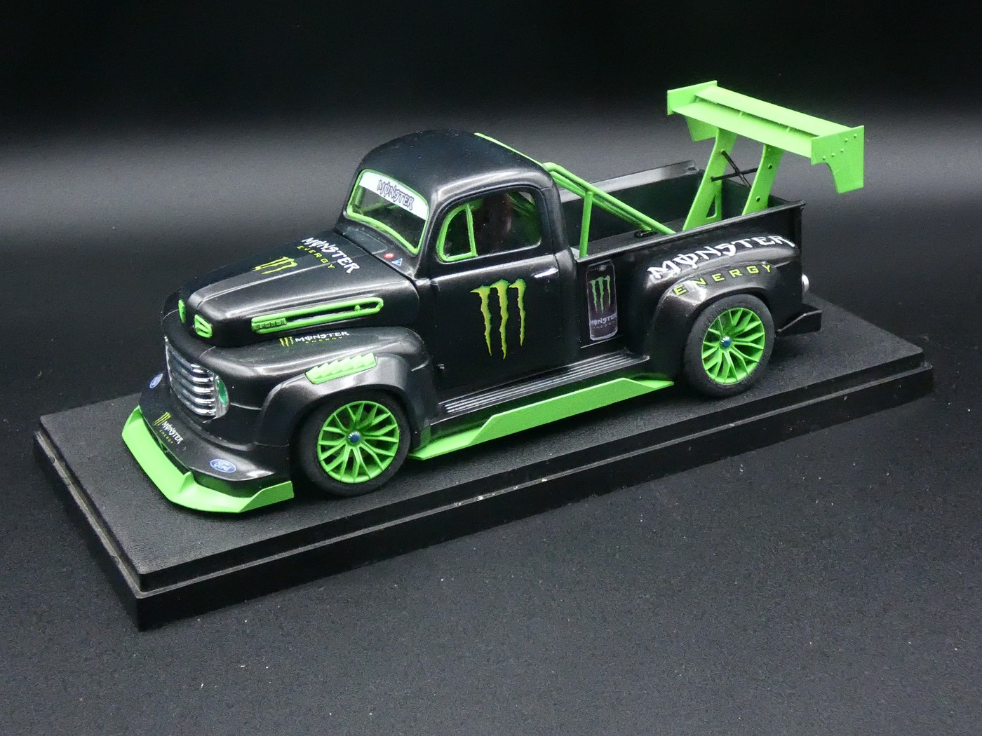 Built from the 1/25 Revell 1950 Ford Pickup. The aerodynamic parts, wheels and tires are from Texas 3D Customs. Nice pieces. The engine is from a Tamiya Cosworth in 1/20 – mixing scales oh my goodness! The interior has a single seat centred, roll cage and part of the dash from the Aoshima Volvo ETCC racecar. Decals are from various sources. Paint is Zero Lamborghini Marrone Apus. The green is Tamiya TS-22 Light green.