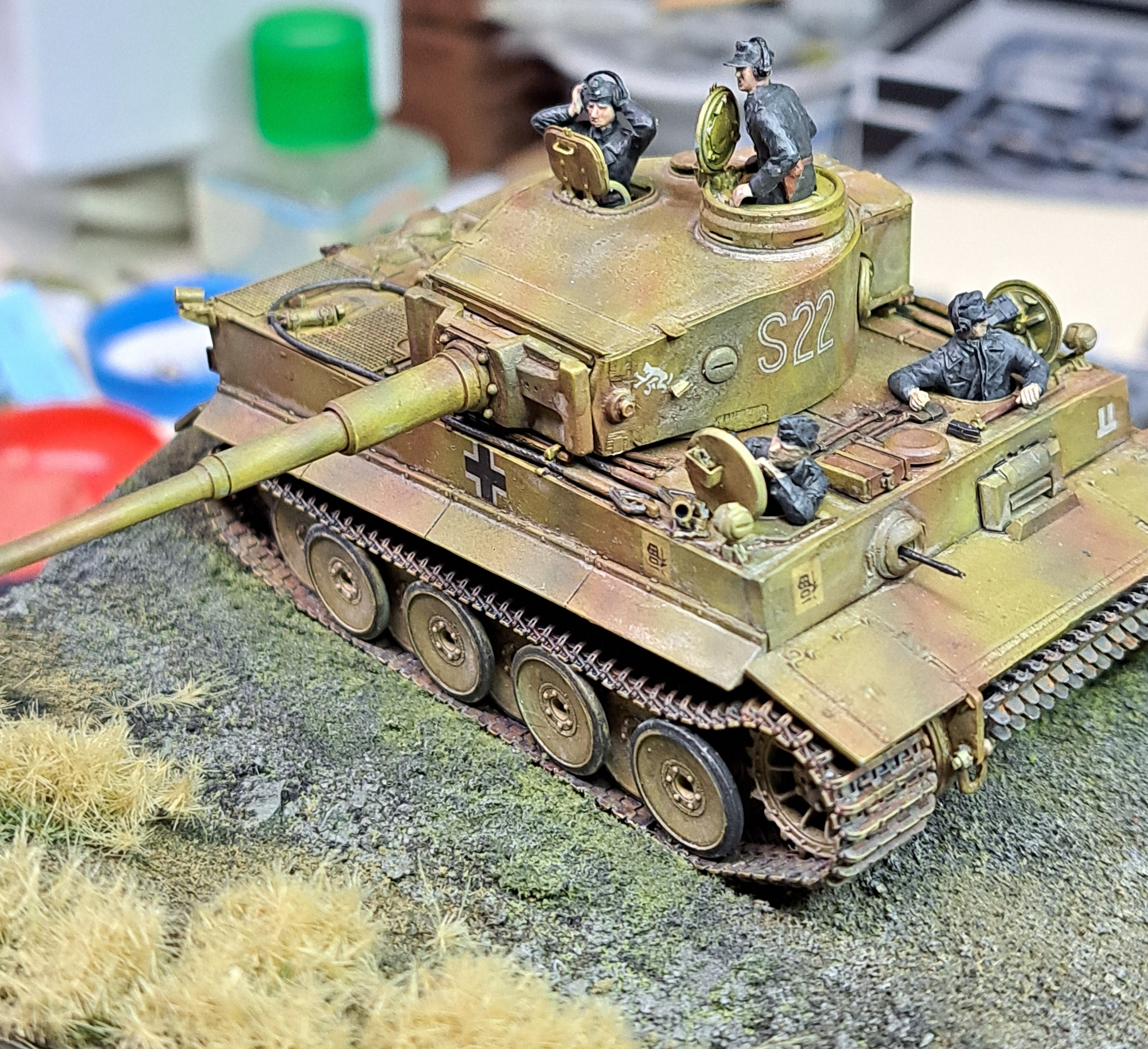 Vespid Tiger I – aluminum barrel, etched brass, 3D printed muzzle brake (from kit). Tracks – 3D printed by Fat Frog. Decals – 8 s.Pz-Kp. S22 with “Lucky Tiger” marking. Airbrushed in cammo and weathered. Base created with plastic stock and RR flocking, then cast in resin. Figures by Tristar and Prieser.