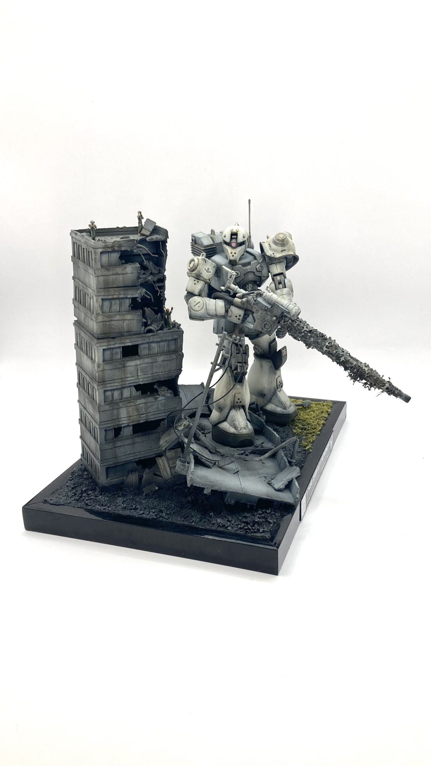 Base kit for this build was the MS-05L Zaku I Sniper Type. Modifications and additions include some scribing, some additional detailing with extra parts, as well as the incorporating of welding seams on the shoulder. There was also the addition of the camouflage netting on the gun. In terms of the diorama most of it was comprised of Bandai’s 30 Minute Missions pre-made buildings and option parts. Finally the overall grey, dark grey and white colour scheme with the weathering and rust streaking was applied to the mecha to give it a more battle hardened look and feel.