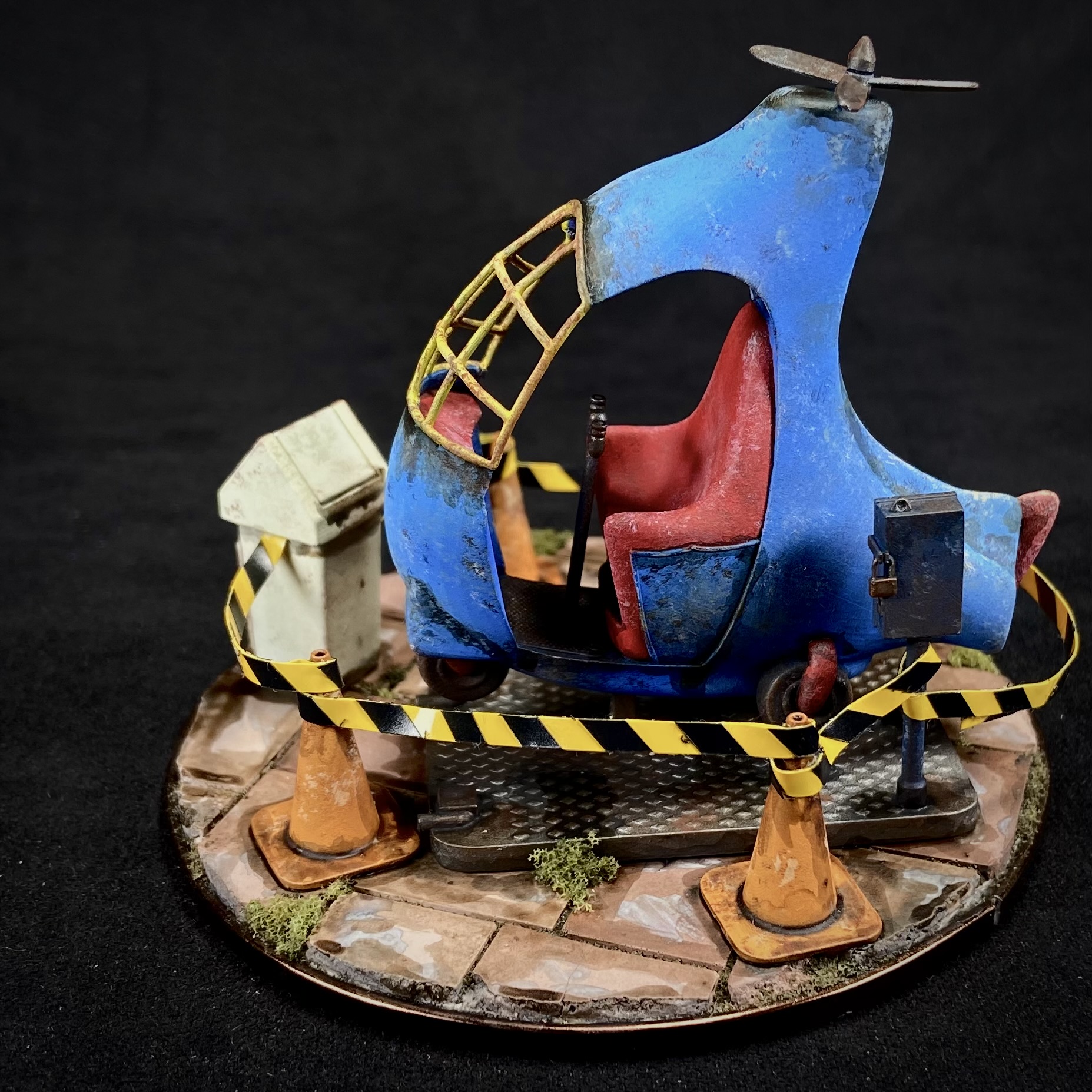 Retro Twirlybird coin-operated kiddie ride. Completely designed, 3D modelled (Blender), and resin printed from scratch using reference photos.