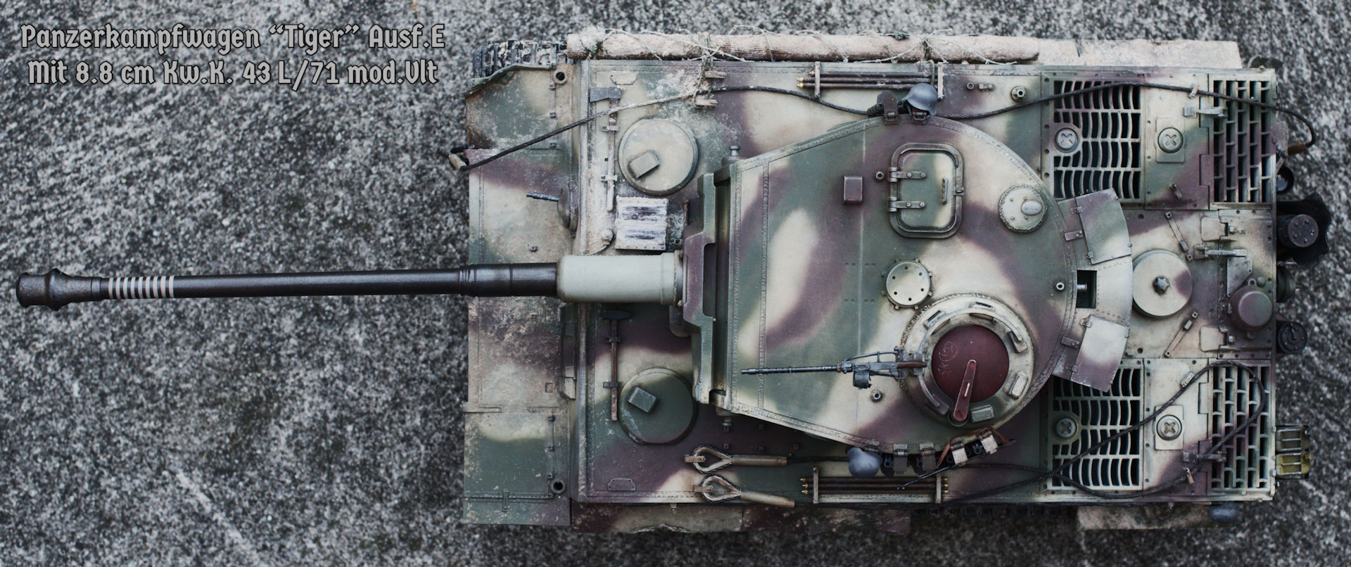 AHHQ Tiger 1 with stock L56/88mm replaced with L71/88mm (King Tiger gun). Kit was modified to resemble World of Tanks in game vehicle including jerry cans, crew items, MG34 commanders gun, barbed wire, unditching log and beat up exhaust. Tank was heavily weathered and base reflects Russian trench overrun including figure.
