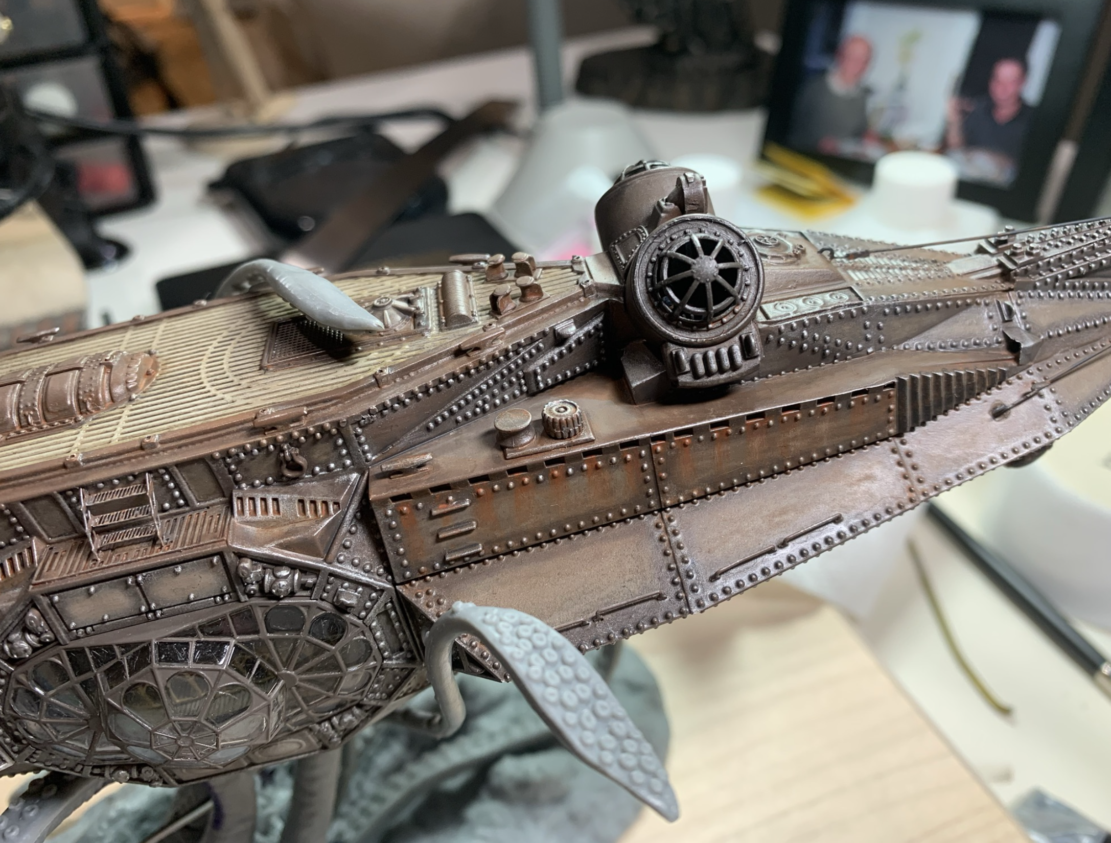 The base kit is Pegasus’ Nautilus from 20,000 Leagues Under the Sea (this is an artist’s design based on descriptions from the Jules Verne novel, and not the Disney film version). The squid base and outcropping immediately beneath the submarine was kit-supplied but blended into a larger scene using DAS modelling clay, sand and glue. The model was lit with a 9V battery and the wiring run up through one of the winding tentacles (tricky). Photos are supplied as the kit has a lot of interior detail, which is difficult to view through the window frames.