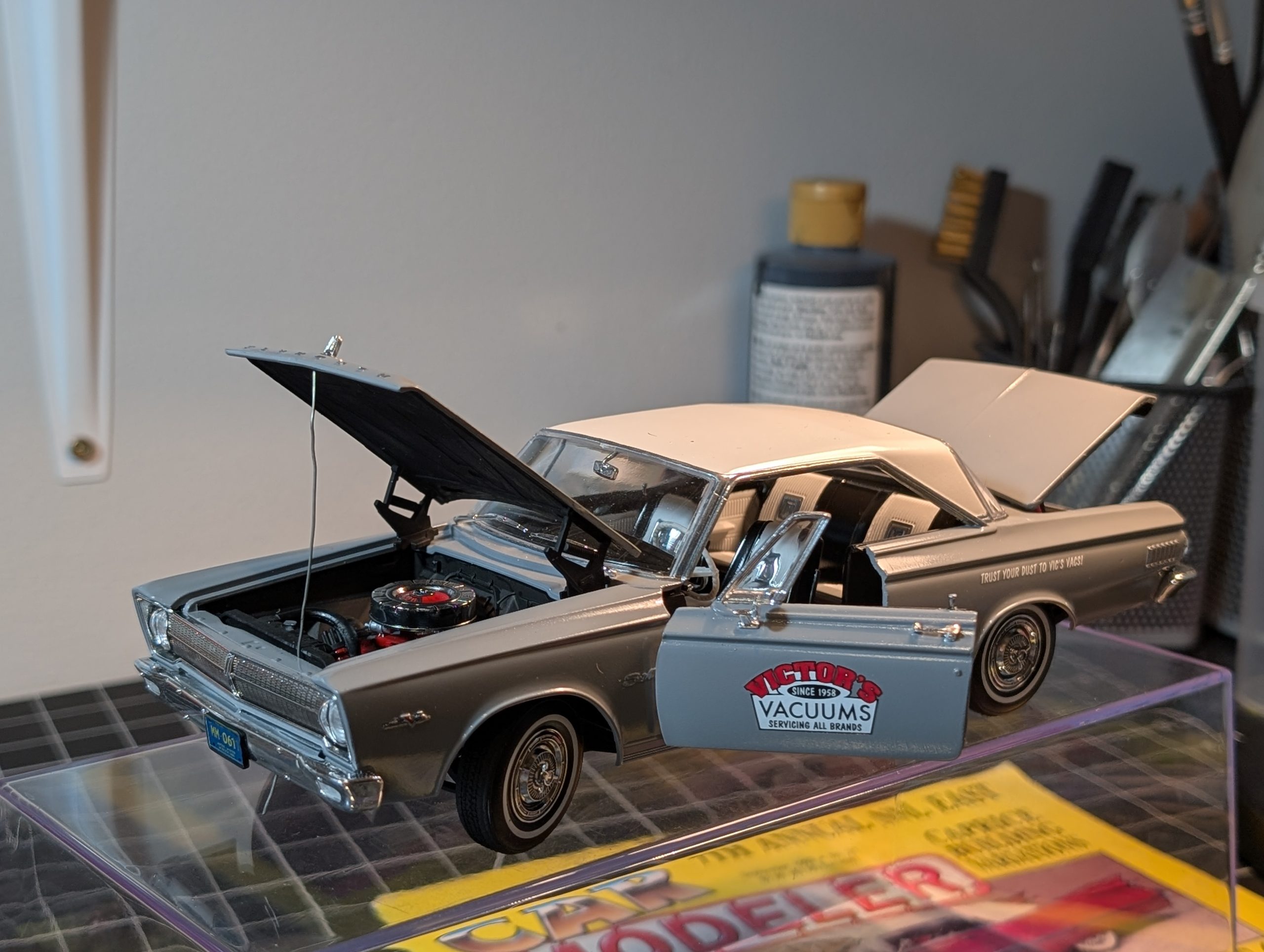 Decals from decal stash, hinged driver side door, trunk, and opened hood. Scratch built vacuum in trunk, 3 vacuum magazines in front seat. “Hoover” storage box in trunk.