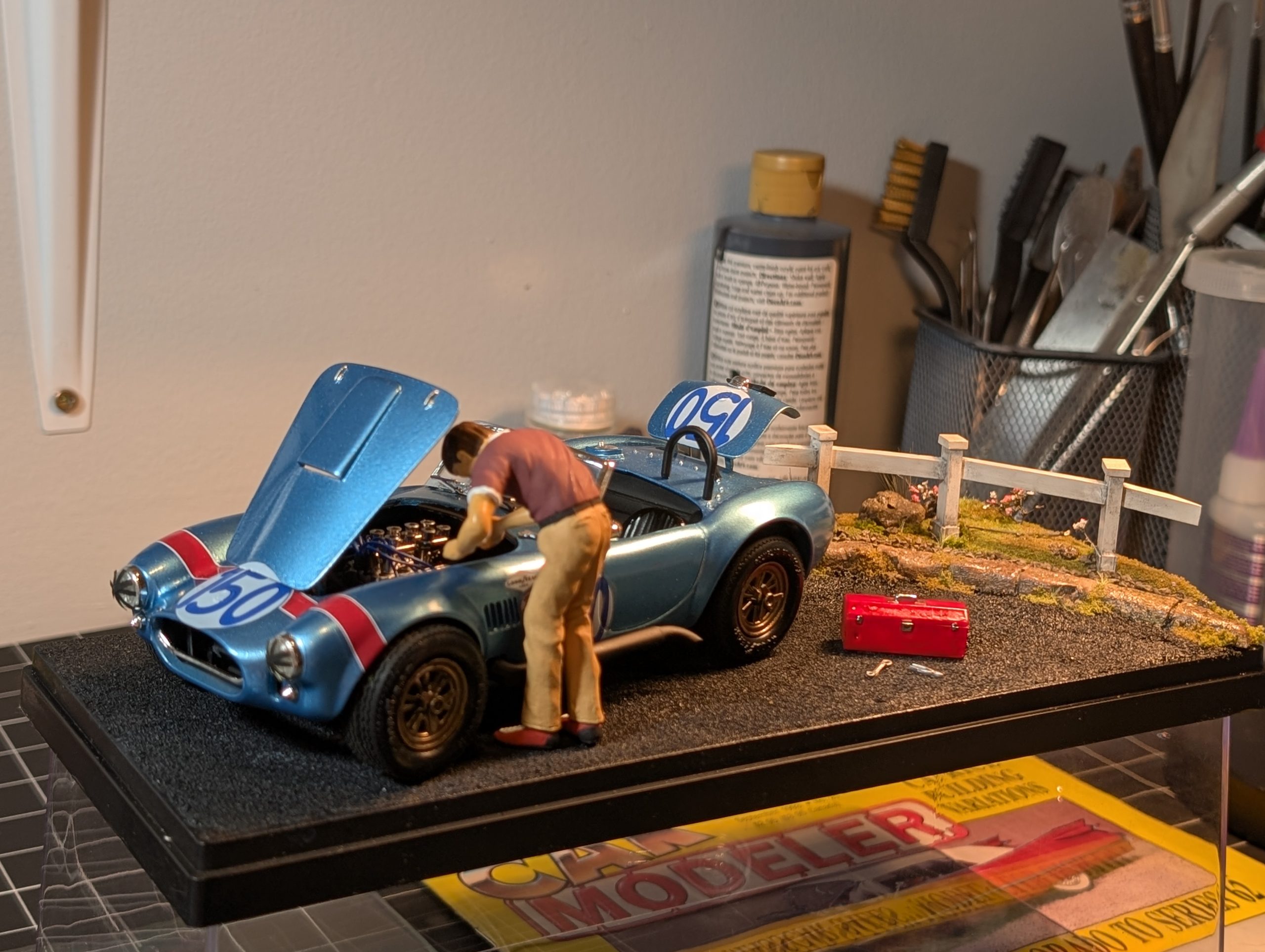 Decals from “LeMans Decals”, scratch built fender louvers, gas cap, protection plate, & licence plate holder. Tape added to headlights, truck tail lights, photo etched seatbelts, wired engine. Front bumper delete, added chrome brace. Reworked rear bumper as well. Scratch built fence, hydrocal casted rocks and curb, sand for road texture, Tamiya tools and toolbox, HO scale flowers for flower bushes. Woodland Scenics turf, static grass. Oil washedmultiple times. Man fixing car figure.