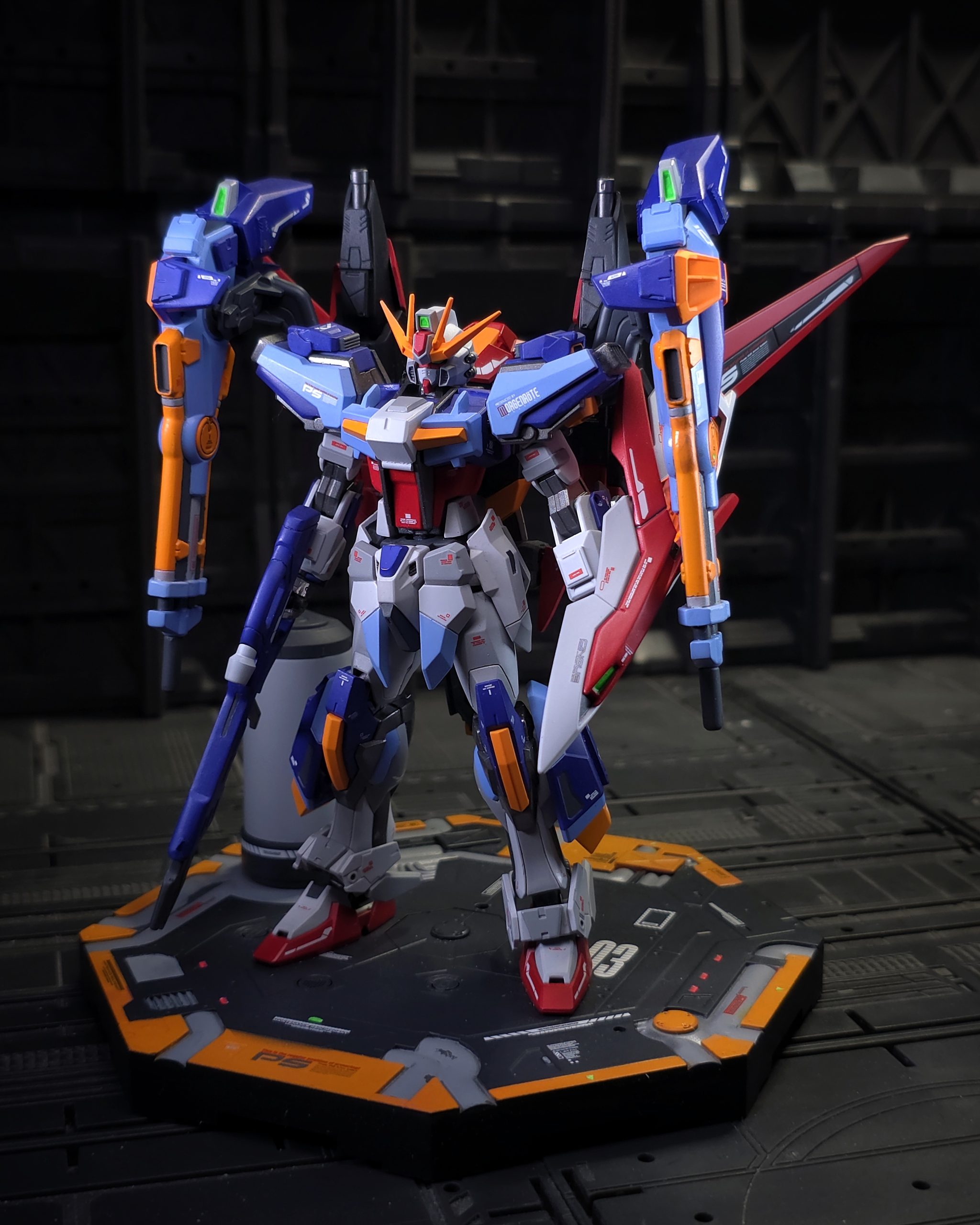 Entry Grade Strike Gundam Exceed is my base. The custom is a kitbash with majority of parts from other seed kits (hg saviour gundam, blaze zaku, windam, cgue deeparms) . The colour scheme is based on the gundam main character ms (ie impulse, strike, desinty) to keep in theme of gundam seed main protagonist. Paints use are mainly tamiya and vallejo. Case is a custom using Bandai Action base 1.