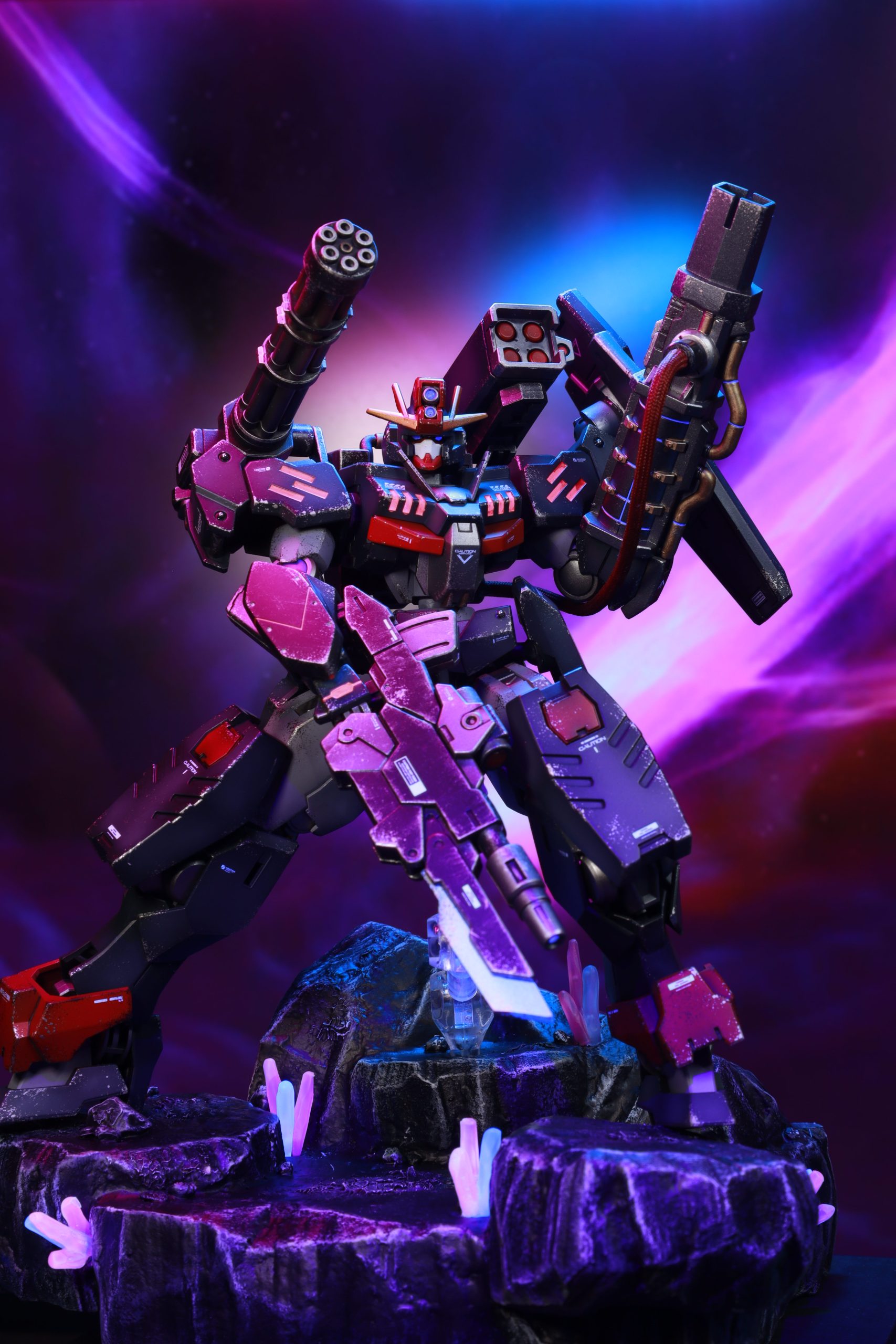 Part of an online group build #calltocommand Call To Command, where we all used the same base kit, I was inspired by retro futuristic music and graphics to create a heavily armed 80’s neon Gundam.