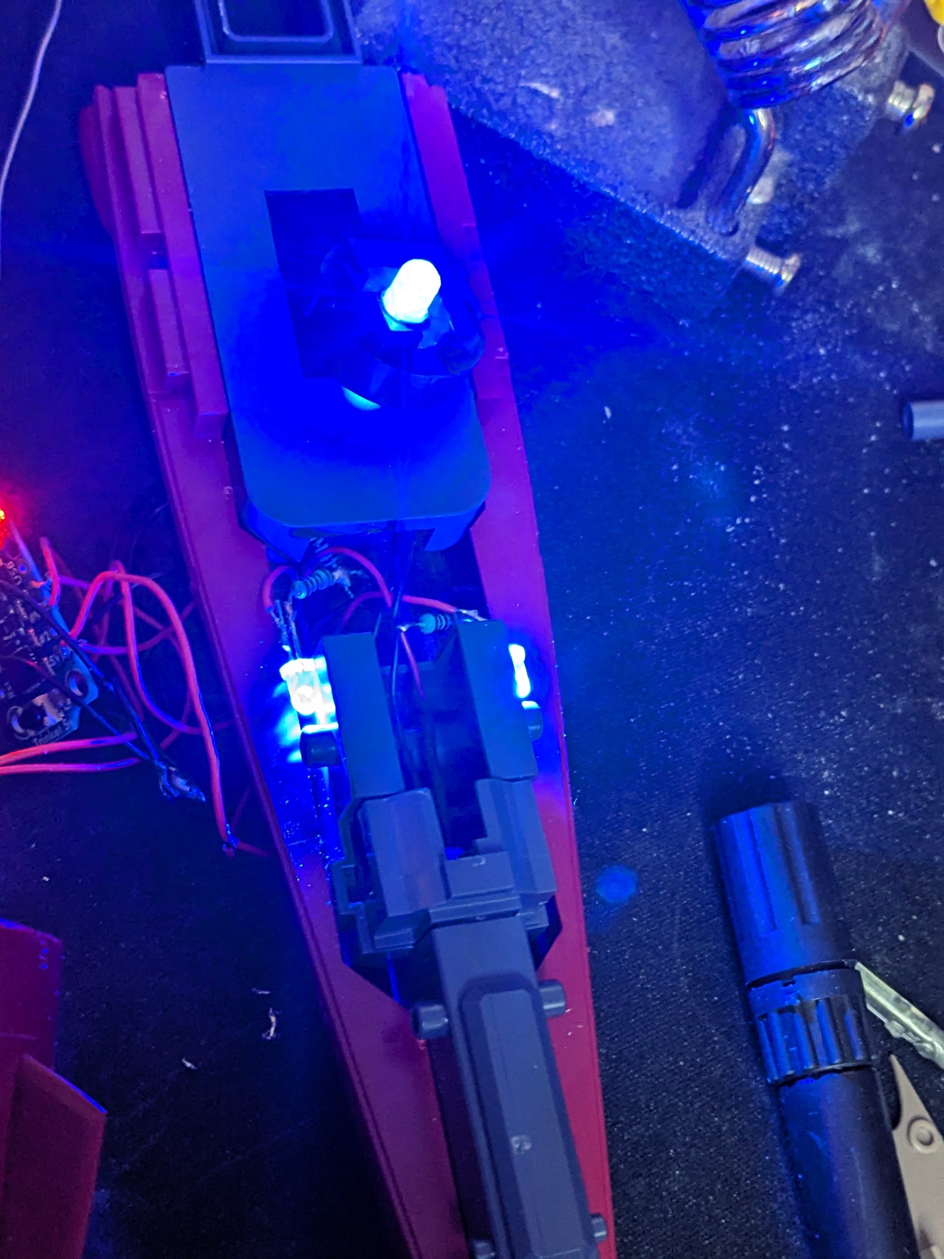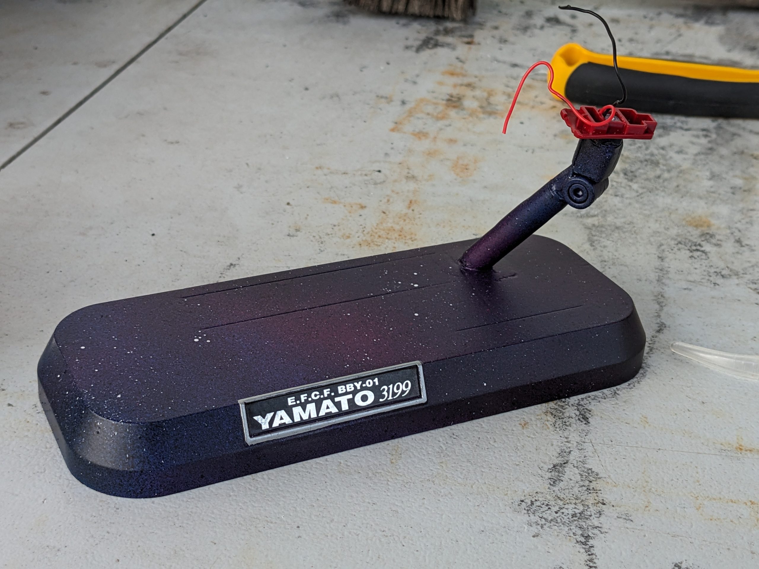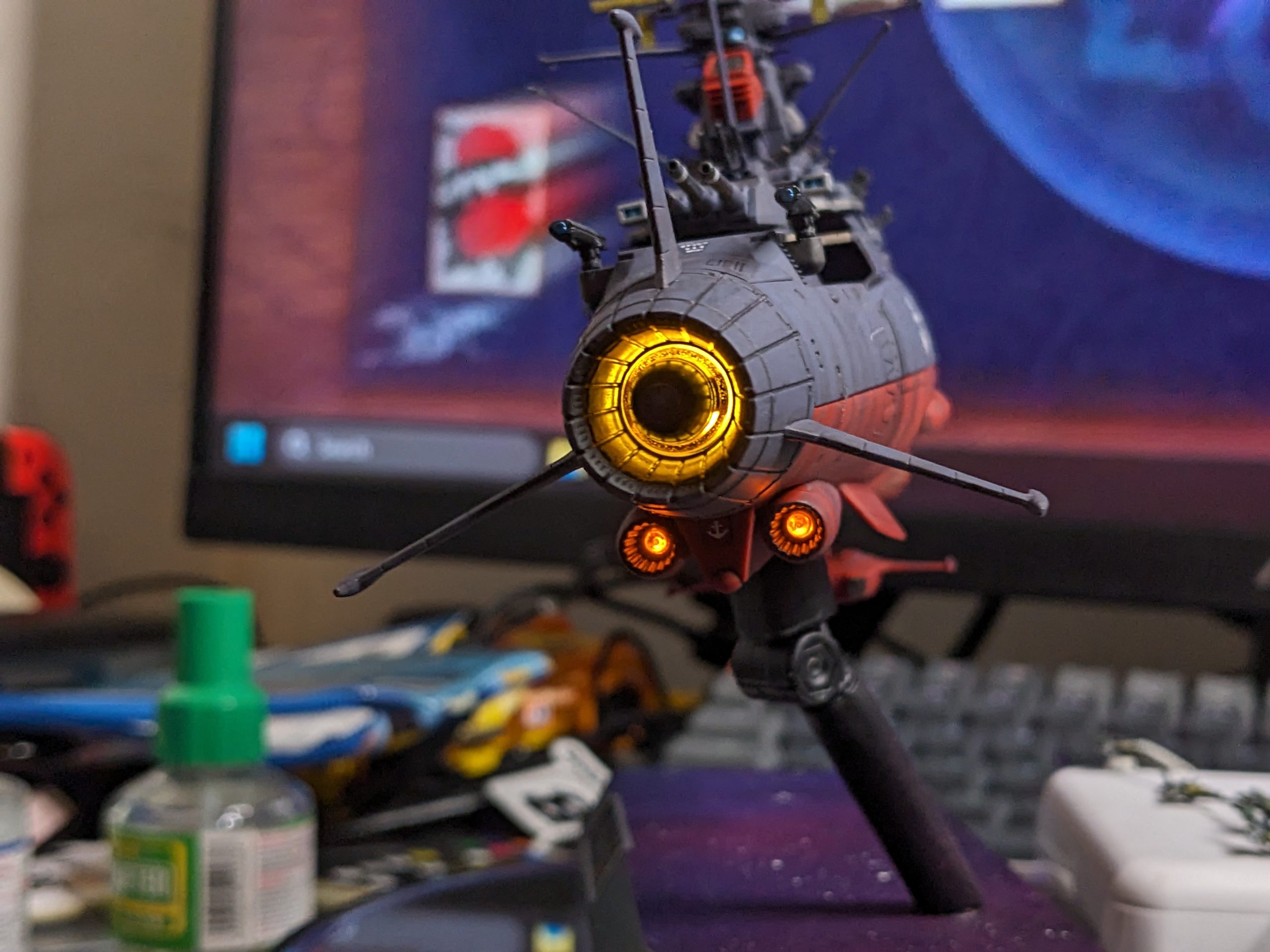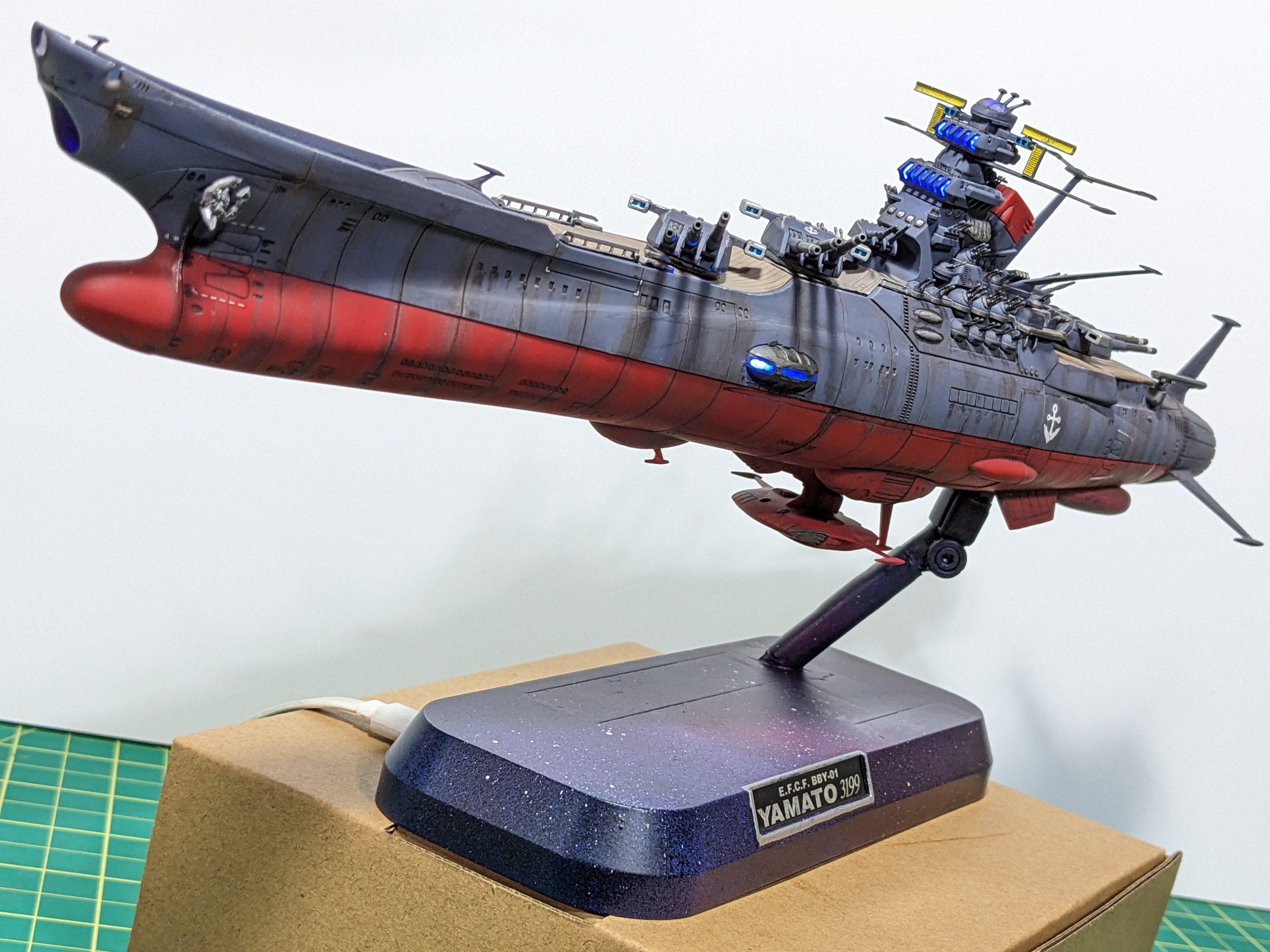 A 1:1000 Bandai Yamato, weathered, detail painted, and decaled. Custom LED lighting and wiring throughout to replace Bandai’s standard LED units. Kit modified to add lit elements, including custom windows added using UV resin. Lighting effects and animations running off of Arduino code on an Adafruit trinket. Main gun has a slow pulse animation, and the rear booster and twin boosters pulse independently of each other to give the impression of flight. Base is a kitbash of the included base and the Bandai action base 8.