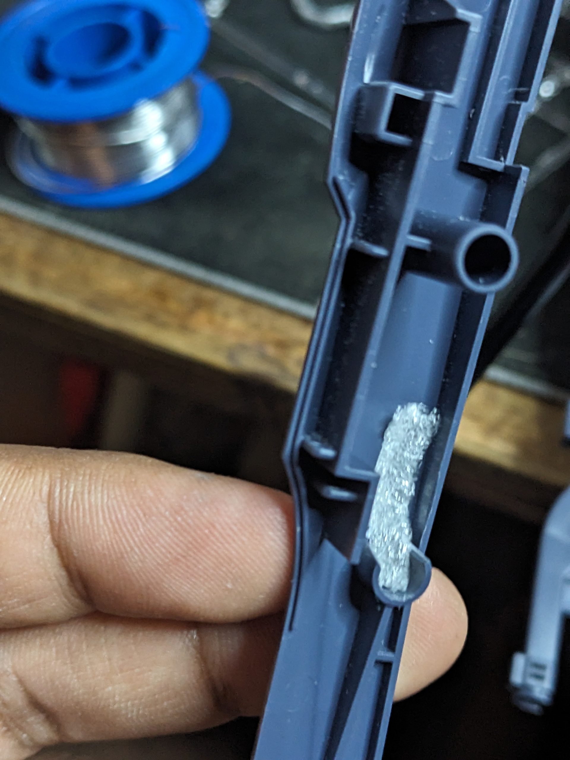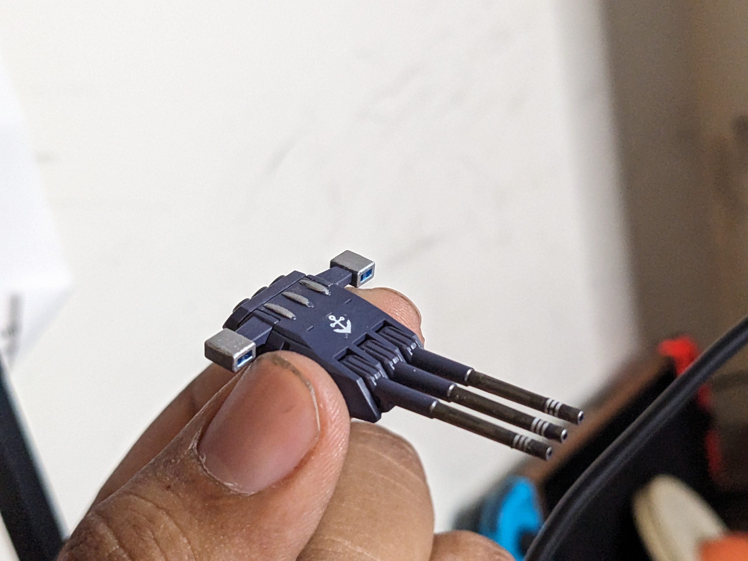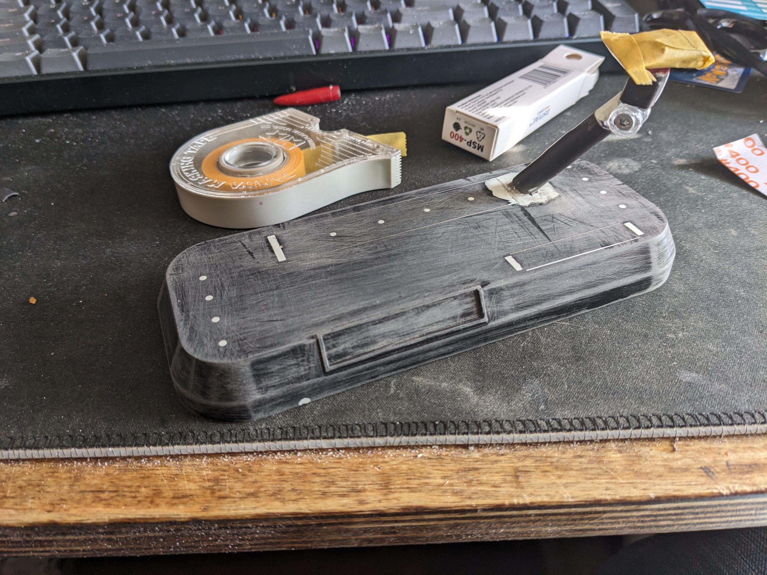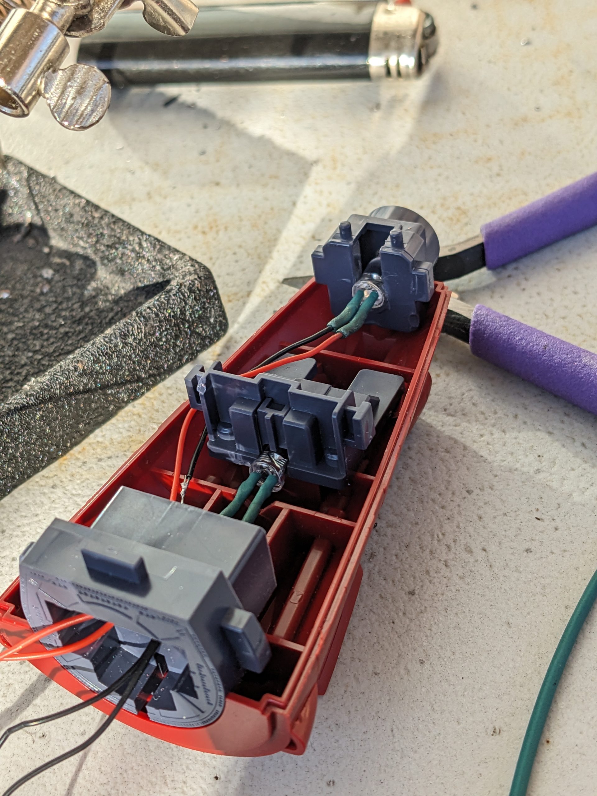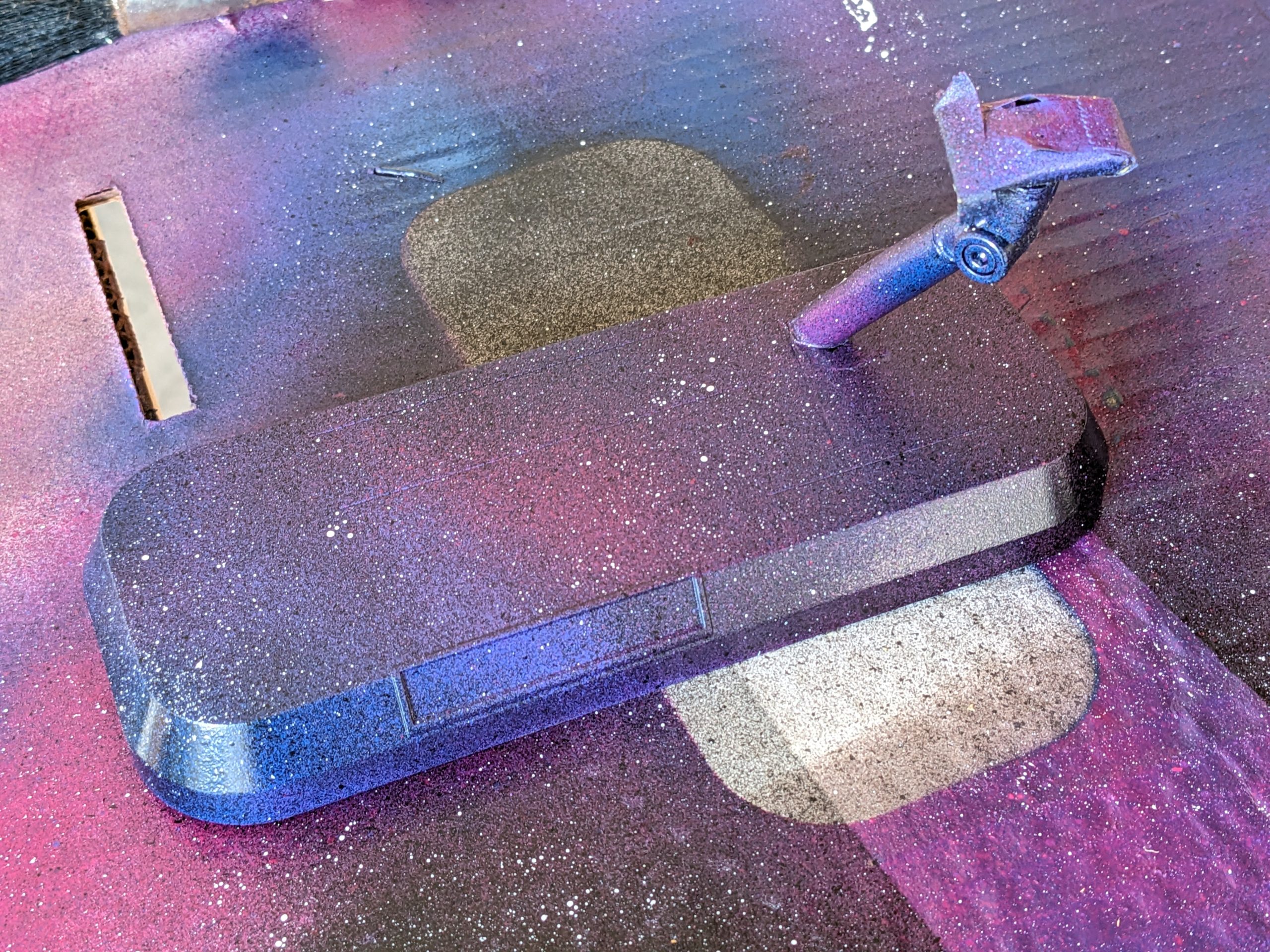 A 1:1000 Bandai Yamato, weathered, detail painted, and decaled. Custom LED lighting and wiring throughout to replace Bandai’s standard LED units. Kit modified to add lit elements, including custom windows added using UV resin. Lighting effects and animations running off of Arduino code on an Adafruit trinket. Main gun has a slow pulse animation, and the rear booster and twin boosters pulse independently of each other to give the impression of flight. Base is a kitbash of the included base and the Bandai action base 8.